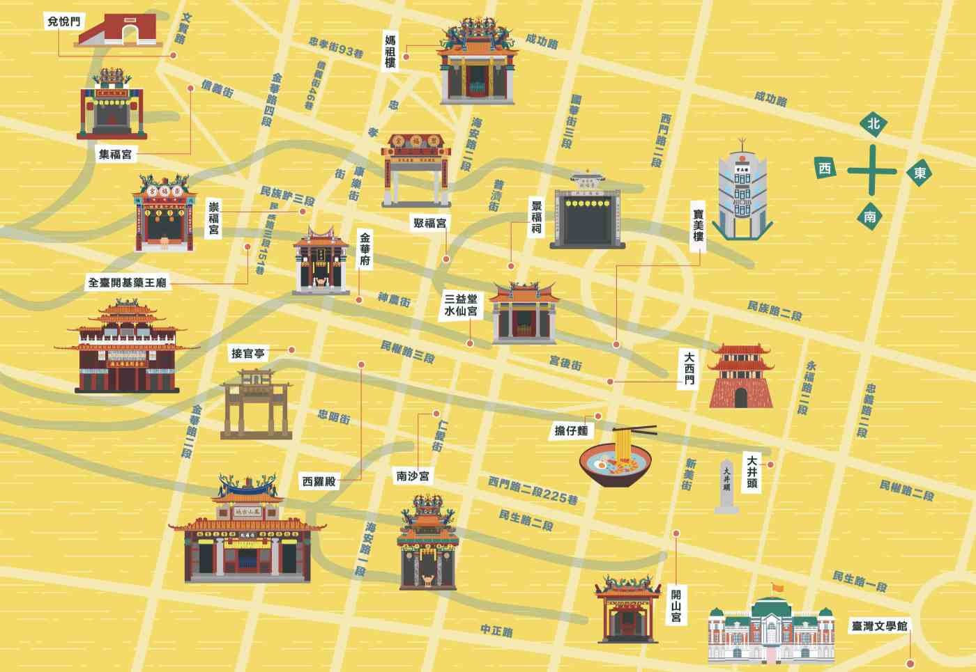 全臺開基藥王廟→風神廟→西羅殿→金華府→南沙宮→水仙宮→寶美樓遺址→景福祠→聚福宮→崇福宮→集福宮→兌悅門