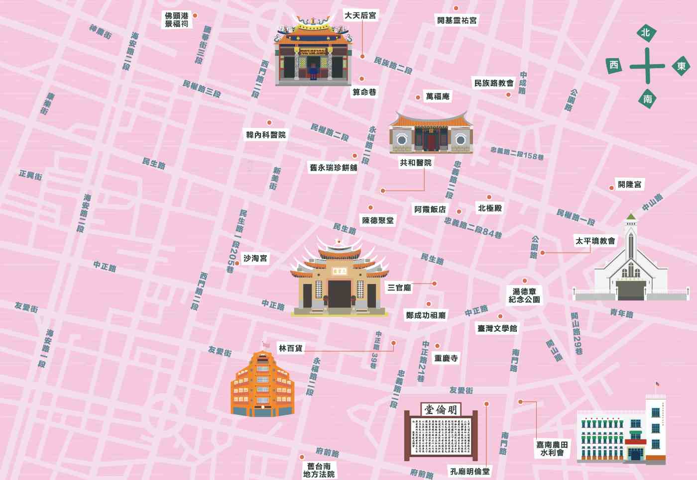 太平境教會→大正公園(湯德章紀念公園) →臺南州廳(國立臺灣文學館)→嘉南農田水利會→孔廟明倫堂→重慶寺→林百貨→鄭成功祖廟→三官廟→萬福庵→算命巷→大天后宮→韓內科醫院→舊永瑞珍餅鋪→共和醫院→陳德聚堂→阿霞飯店→北極殿