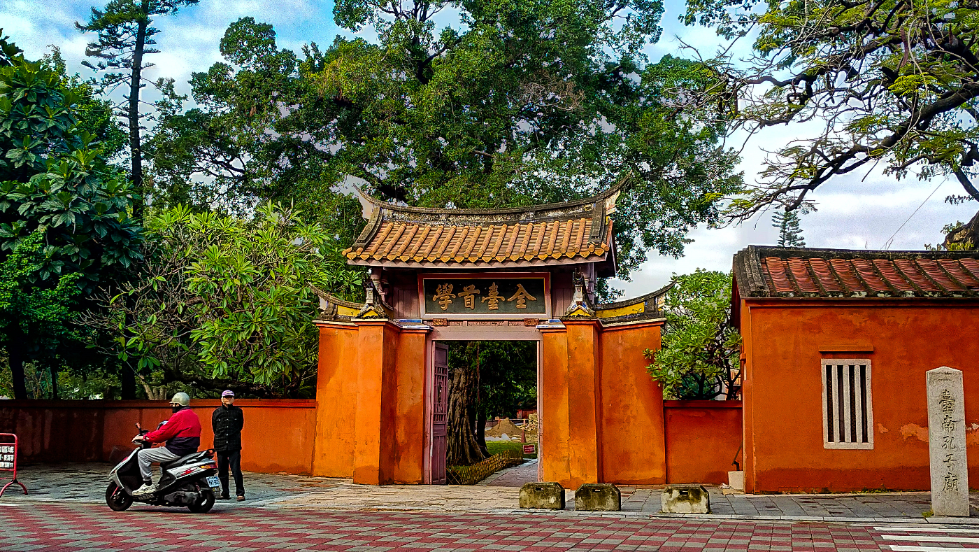 臺南孔子廟是臺灣第一座孔廟,建於1665年,為臺灣最早的文廟,時稱先師聖廟。清領初期是全臺童生唯一入學之所,因此稱「全臺首學」。清代前後多次整修並增建。乾隆四十二年(1777)臺灣知府蔣元樞大規模整修,並增建泮宮石坊,如今規制大致成形。日治初期曾充為近衛師團營舍病院,1898年在此設立臺南(第一)公學校(今南大附小)。大正六年(1917)動工整修,破敗的朱子祠、櫺星門、明倫堂後的文昌祠等則不再復建。昭和9年(1934)因拓寬今南門路,泮宮石坊被往東移而從孔廟的入口轉而變為柱仔行街(府中街)的入口。