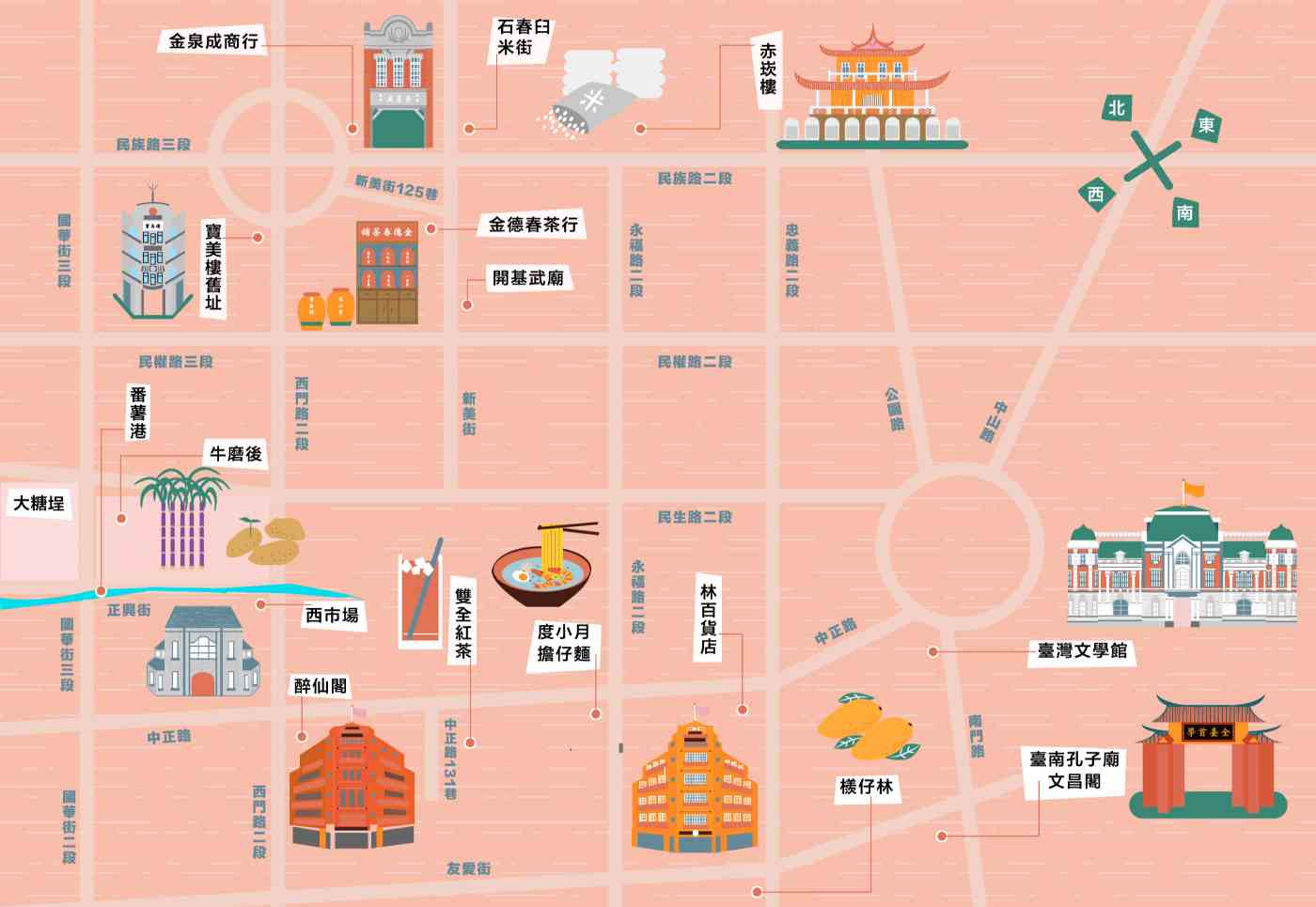 金泉成商行→金德春茶行→寶美樓遺址→牛磨後、大糖埕、番薯港→西市場→醉仙閣遺址→雙全紅茶→度小月擔仔麵→林百貨