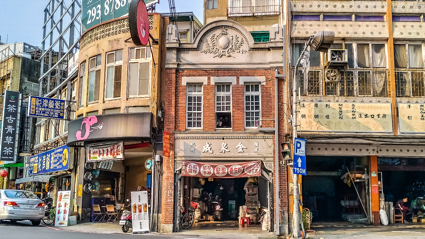 金泉成雜糧行在1908年創立於米街(新美街),1925年開闢民族路時才移至現址。位於三角窗的歷史式樣建築很吸引行人注目,但鮮少有人能注意到二戰期間軍機機關槍掃射在建築物立面造成的彈孔。戰爭期間金泉盛商行曾遭逢回祿,除了建築立面以及店內左右牆之外,其他部分幾乎全毀,是戰後才由兄弟們攜手重建。金泉成現已傳至第三代,五位兄弟自父親手中接管數十年以來從未提過分家一事,唯五弟從事教職自往少有插手、大哥退休、以及一位兄弟仙逝,現今僅剩王東林及王錫碧二位看管老店,對老店的昔日風光亦不勝唏噓。其最早以豆類買賣為主,四十年前曾開發薏仁粉,但當時薏仁較貴,且民眾沒有吃薏仁的養生觀念,故當時銷量不好;直到三十年前吃「米仔麩」風氣漸開,生意才又好起。現今則因應現代人養生需求,另外開發其他穀粉豆粉,也有結合中藥材的米仔麩也頗受消費者歡迎。
