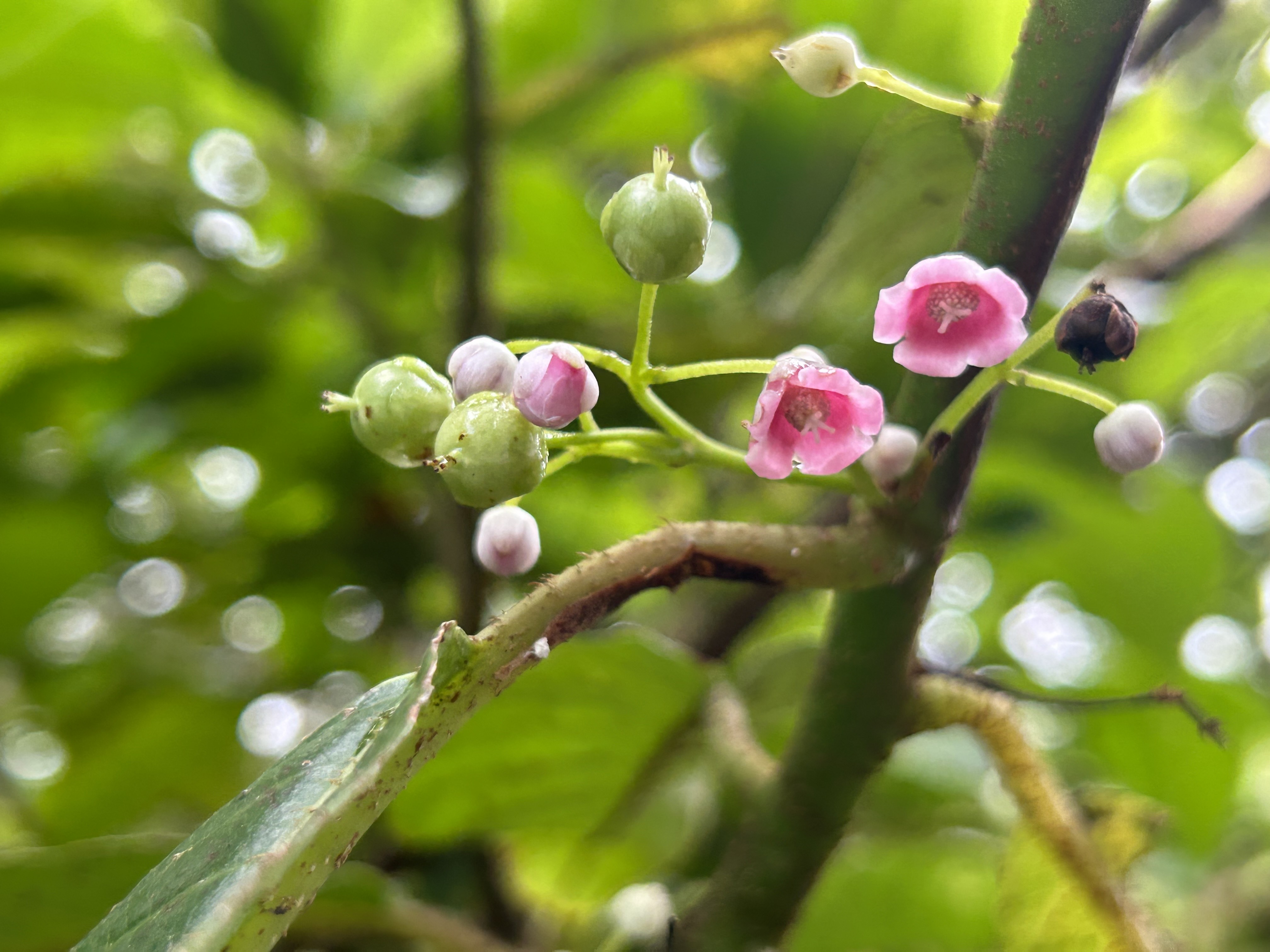 除了經濟作物,路途上的「水冬瓜」會開粉紅色的花。可以觀察到他的花跟果實是直接長在樹幹上,能更快獲得養分。除了觀賞,水冬瓜的果實在7月到11月時熟成雪白色時可以食用且很甜。