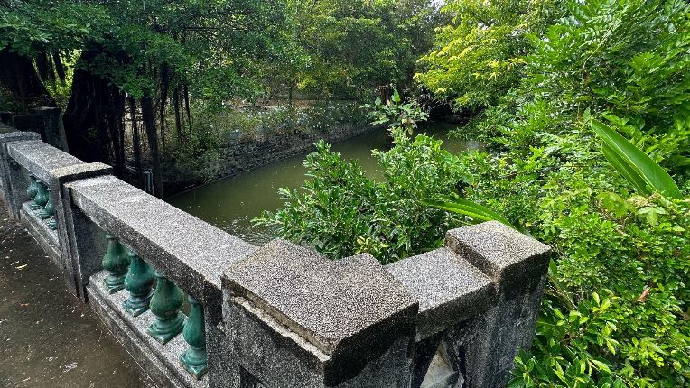 繞過大榕樹,前方便是園子的入口。一進入不久,迎面而來的則是一道小巧可愛的石橋。此橋名為「豁然橋」。站在此處,其意一目了然:背後是筆直狹窄的園徑,前方則是豁然開朗的三秀園園景。這樣的設計,或者多少也與《桃花源記》中「初極狹,才通人,復行數十步,豁然開朗。」的記載有關吧!而一進園,舉目又何嘗不是「土地平曠,屋舍儼然,有良田美池桑竹之屬。阡陌交通,雞犬相聞。」的美景呢?