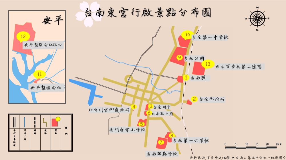 「臺南東宮行啟小旅行」是1924年4月16日到4月27日,日本殖民臺灣約30年後,當時的皇太子裕仁獲總督田健治郎之邀訪問臺灣的巡查路線。「皇太子外出稱『行啟』。行啟2個以上地區稱『巡啟』,藉視察區域了解領土內發展情形,以實際掌握統治權力。」因此,「行啟」寓有其政治意義。   「臺南東宮行啟小旅行」由臺南大學龔千晴、邱苡庭兩位同學製作,是國立臺灣文學館與臺南大學合作課程成果之一 ...